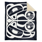This beautifully crafted blanket, designed by Tsimshian artist Roy Henry Vickers, captures the dual nature of the Raven in Indigenous stories. The Raven holds a special place as both trickster and creator, where the black Raven embodies the trickster while the white Raven represents the creator. For Vickers, the Raven is not just a symbol but a Chiefly crest from his ancestral House of Walkus in Wuikinuxv, British Columbia. The blanket provides incredible warmth and softness, making it perfect for cozying up or adding a touch of modern luxury to any room. It is conveniently machine washable for easy care and comes neatly packaged in a clear zipper-closed bag for clean and effortless storage. Measuring 127cm by 152.4cm, this piece is both a work of art and a source of comfort.